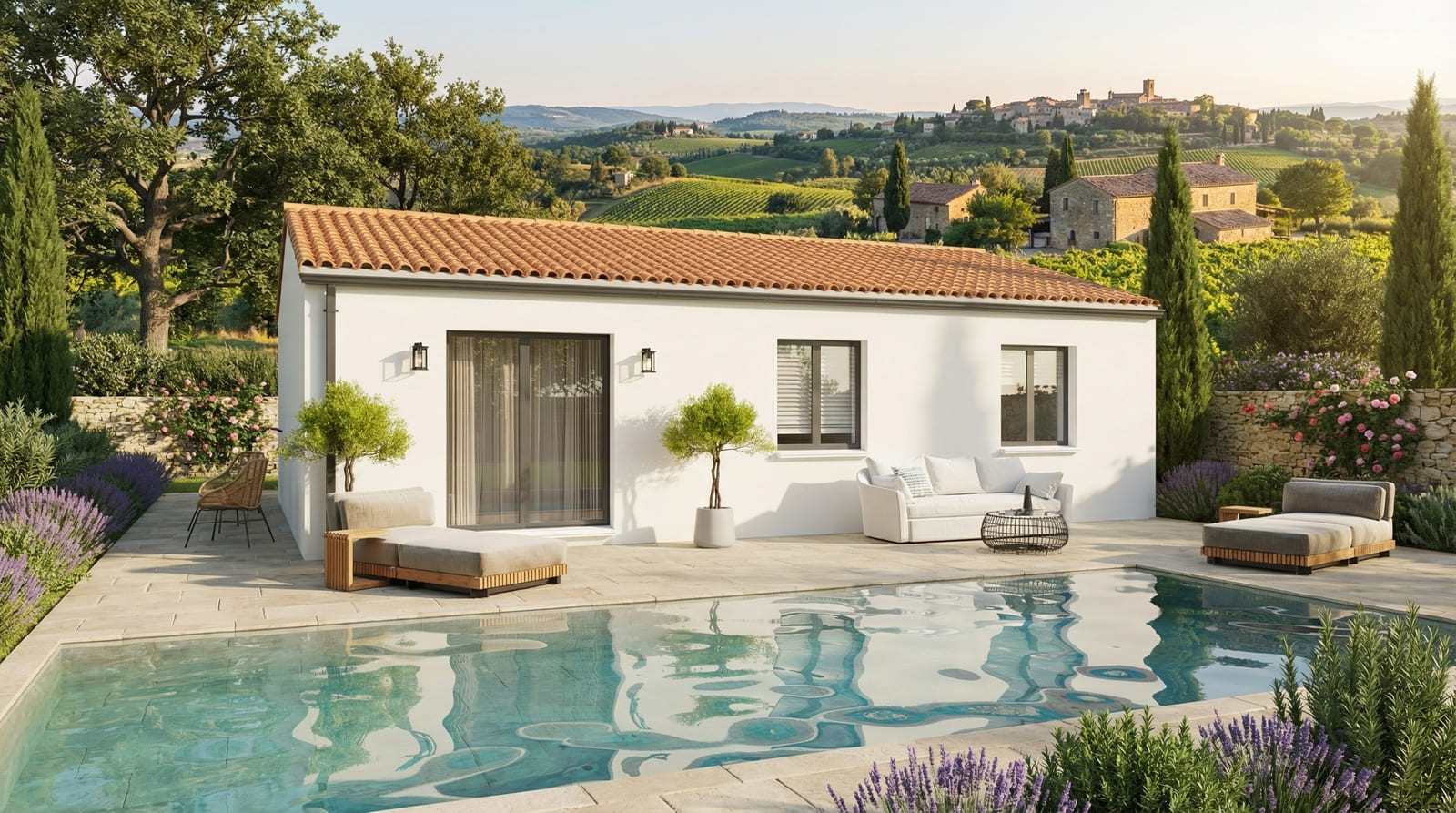 🔹 Toiture faible pente avec tuiles canal, idéale pour une meilleure protection contre la chaleur